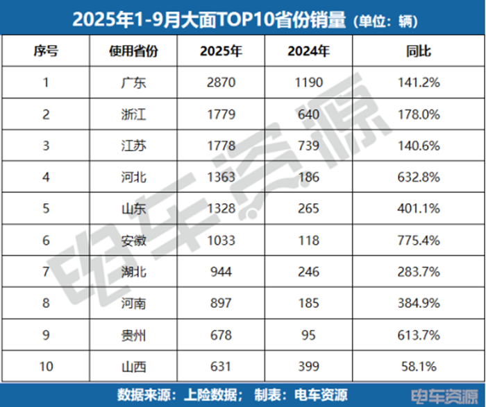 而在9月大面的高增長格局中,多個省份實現(xiàn)跨越式增長。安徽以775.4%的同比增幅位居榜首,河北、貴州、山東、河南緊隨其后,同比增速分別 632.8%、613.7%、401.1%和384.9%,均遠超全國209.6%的平均水平。