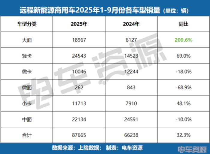 根據(jù)電車資源統(tǒng)計(以下數(shù)據(jù)僅包含新能源物流車,不包含重卡、客車),從數(shù)據(jù)來看,2025年1-9月,遠程的大面車型同比完成從6127臺到18967臺的跨越式增長,成為拉動整體銷量的核心動力;輕卡、小卡車型同步跟進,分別實現(xiàn)69.0%和48.1%的同比增長,展現(xiàn)出新能源物流車主力車型的穩(wěn)健潛力。