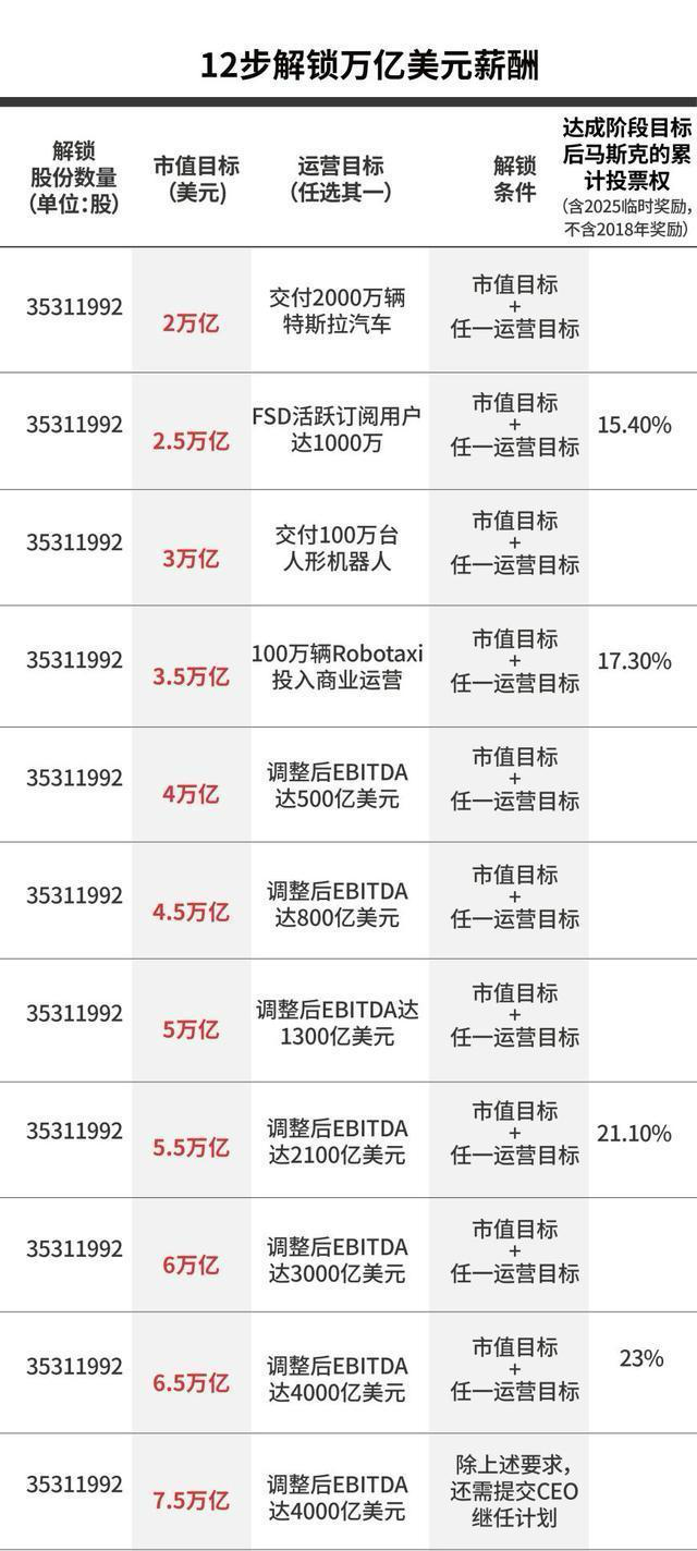 該計劃設立12項運營目標,馬斯克每完成一項,便可獲得約占特斯拉市值1%的股票。該計劃同時要求特斯拉市值穩(wěn)步增長,如果全部達標,馬斯克將獲得特斯拉12%的股票,屆時按預想市值達1萬億美元。