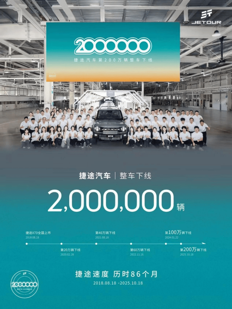 從2018年第一輛車問世,到2025年第200萬輛下線,捷途只用了七年——在全球汽車產業的時間軸上,這幾乎是一個“不可能的數字”。在如今的汽車行業,200萬臺不只是銷量數字,它代表著品牌跨越“存量門檻”的分水嶺。對于一家僅成立七年的年輕品牌而言,這個里程碑的意義,遠不止“跑得快”,更在于“跑得穩”。它說明捷途已經從市場的變量,成長為行業的常量。