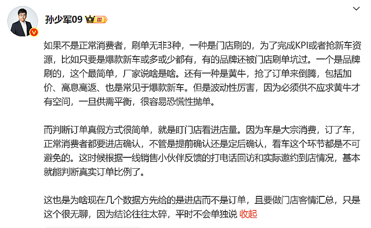 媒體稱汽車刷3萬訂單需要300萬元,汽車博主孫少軍轉發(fā)并詳解方法