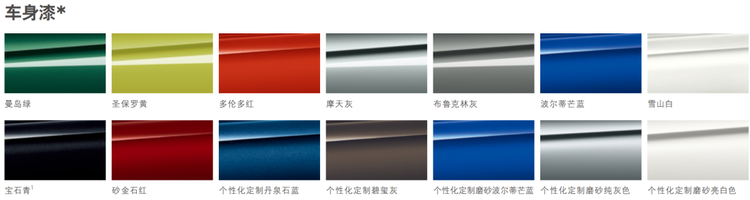 車漆方面,標配曼島綠、圣保羅黃、多倫多紅、摩天灰、布魯克林灰、波爾蒂芒藍、雪山白、寶石青、砂金石紅,可以個性化定制丹泉石藍(10100)、碧璽灰(10100)、磨砂波爾蒂芒藍(23200)、磨砂純灰色(23200)、磨砂亮白色(23200)以及個性化定制特別涂裝(35000)。