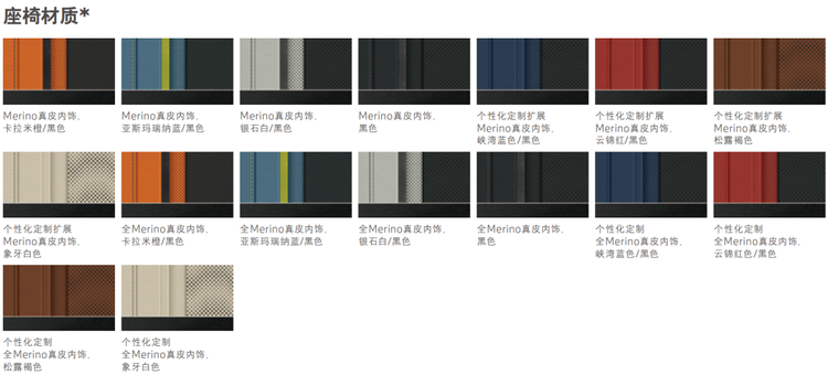 內部座椅材質也有很多樣式可選,Merino真皮標配的有黑色、卡拉米橙/黑色、亞斯瑪瑞納藍/黑色、銀石白/黑色;擴展Merino真皮標配的有峽灣藍色/黑色、云錦紅/黑色、松露褐色、象牙白色;此外還可以花錢選裝各種全Merino真皮內飾。