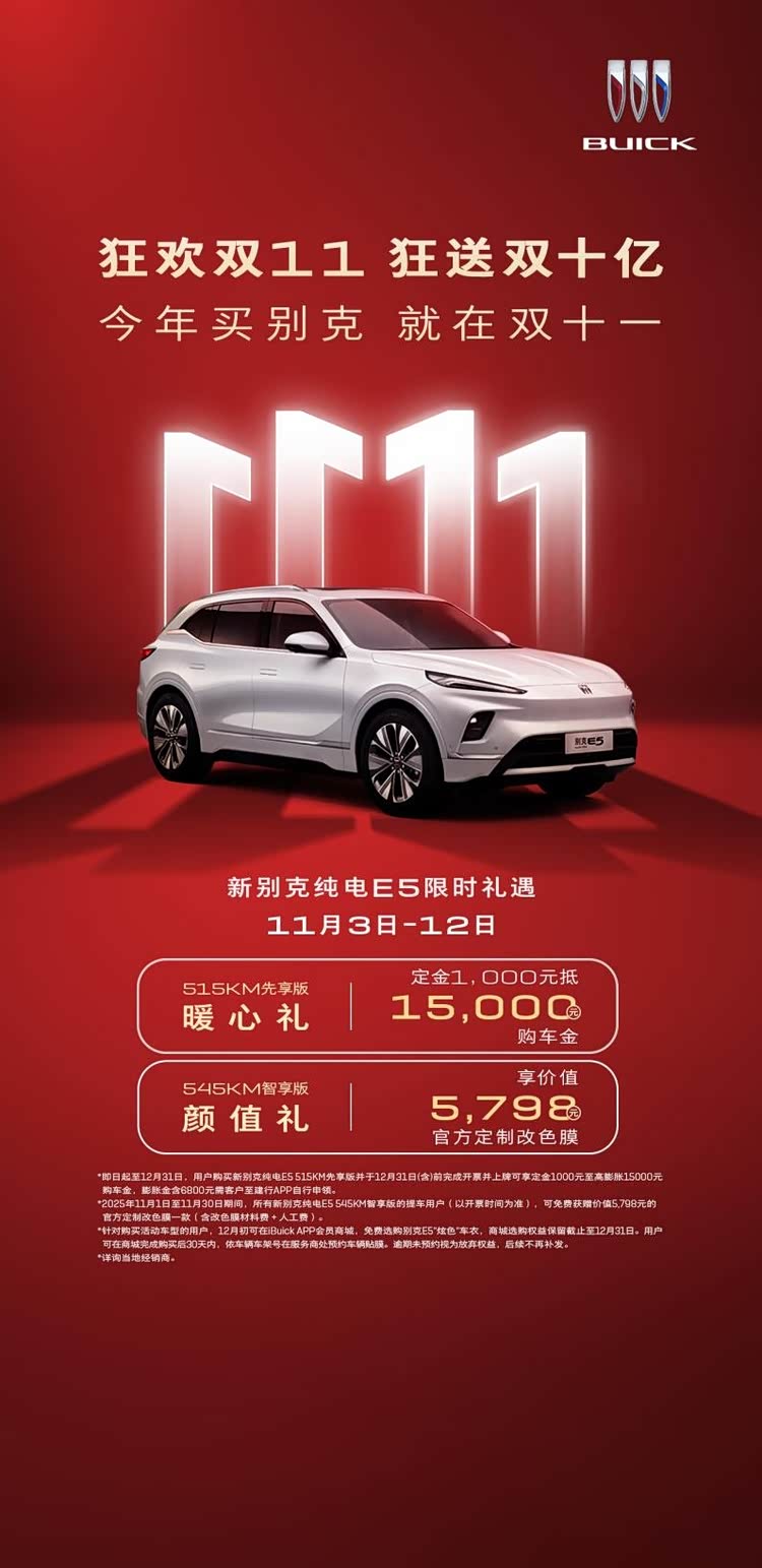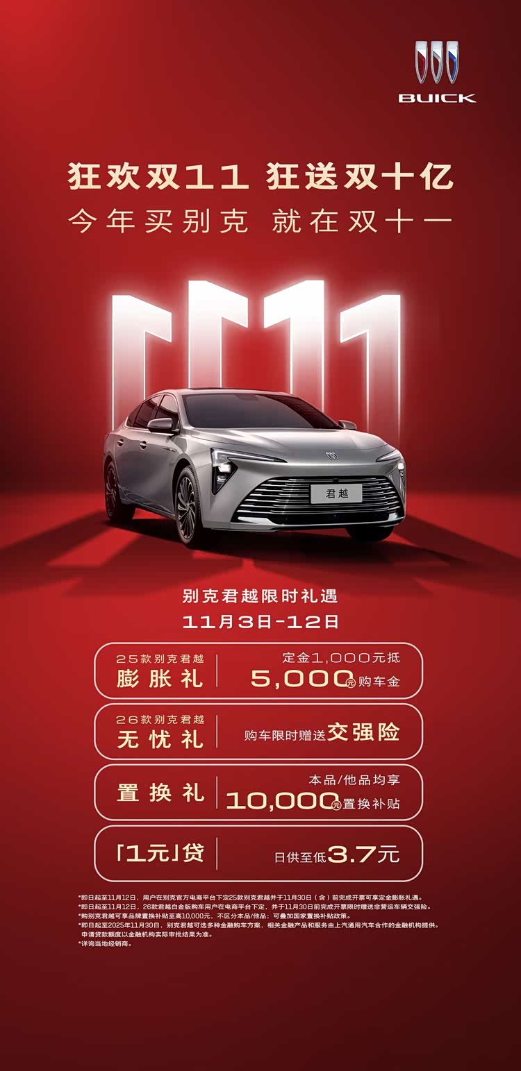 2025年11月3日 上汽通用別克正式啟動(dòng)“狂歡雙11,狂送雙十億”限時(shí)大促活動(dòng)。即日起至11月12日, 昂科威Plus(參數(shù)|詢價(jià))、昂科威S、君越、君威、別克E5等主力車型福利加碼,結(jié)合多項(xiàng)購(gòu)車禮遇,為消費(fèi)者提供“無套路、真讓利”的年內(nèi)購(gòu)車最佳機(jī)會(huì)。 —— 今年買別克,就選雙十一!