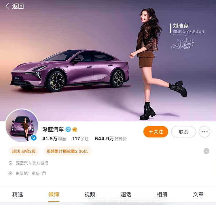打開微博驚訝發現,深藍汽車官方頭像直接換成劉浩存和 深藍L06(參數|詢價)的合拍照,這波“官宣”力度簡直是拉的有夠滿的。