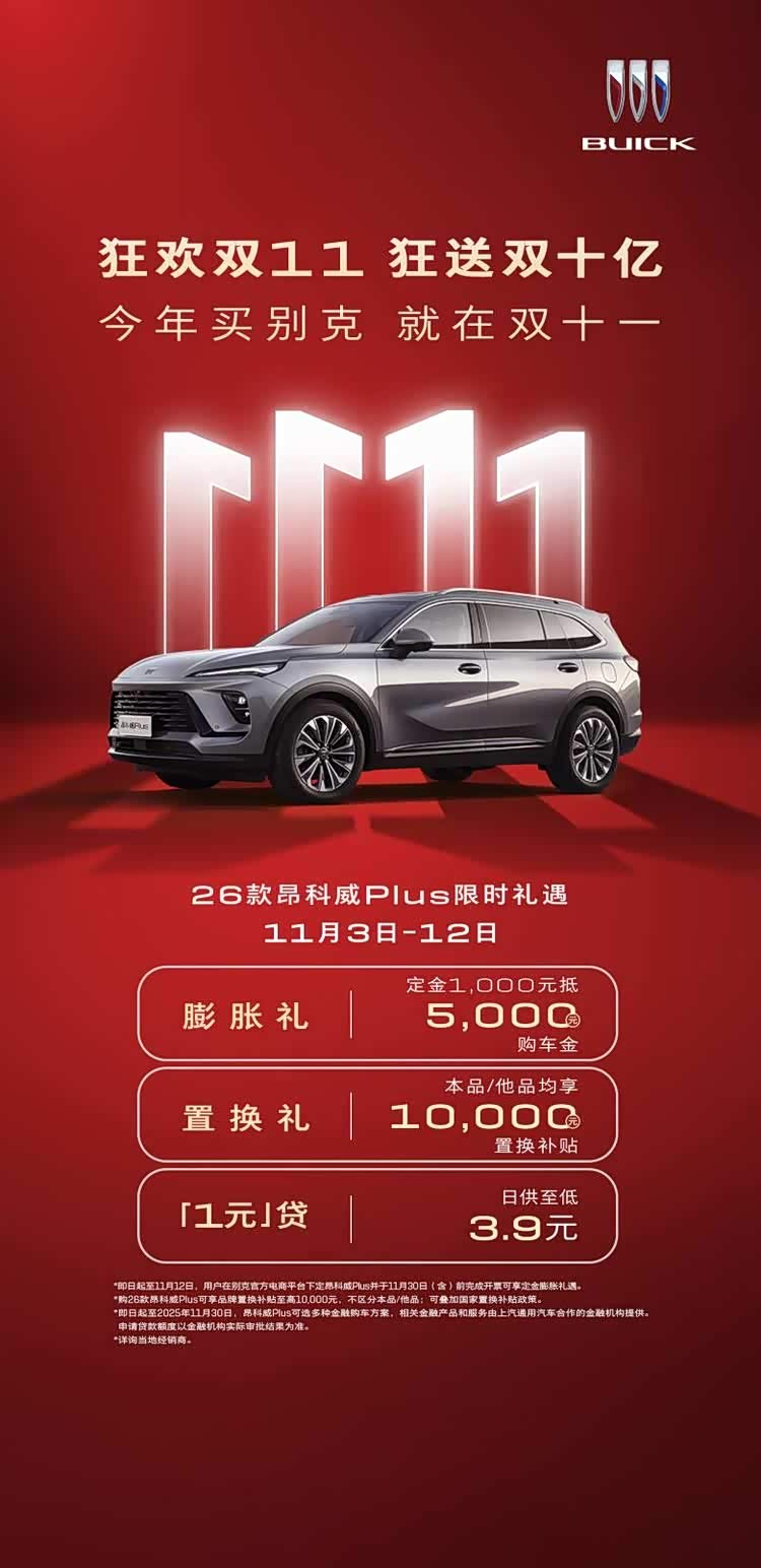 每年雙十一,汽車圈的“價格戰”從不缺席,但多數品牌的“優惠套路”讓消費者望而卻步——疊券、砍價、隱藏條件,最后算下來讓利寥寥。而今年,上汽通用別克直接甩出“狂歡雙11,狂送雙十億”的大招,11月3日至12日, 昂科威Plus(參數|詢價)、君越、別克E5等主力車型限時直補,用透明定價和真金白銀的補貼,打破了行業“比價焦慮”。