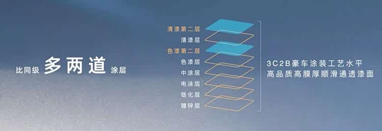 為了讓i60更好看、更高級,設計師在車漆工藝上花了很大功夫。埃安i60比同級多了一道色漆層和一道清漆層,達到了豪車級別的“3C2B車漆噴涂工藝”水平,讓漆面顯得更精致,同時也更耐磨。兩道清漆層達到雙倍抗氧化、抗紫外線的效果,防腐性能更優異,讓車漆經久不褪色。