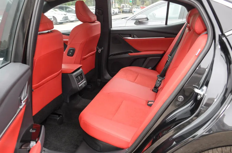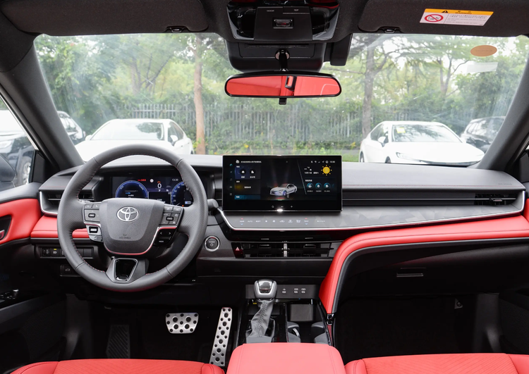進入車內,凱美瑞取消了Y字形設計,采用了T字形的布局結構,而且能夠營造更為簡約的美感。特別是細節上很用心,比如12.3英寸的液晶儀表帶有遮陽設計,12.3英寸的中控屏帶高通驍龍8155P芯片,并且支持CarPlay,CarLife,Hicar常用設備。然后在美感方面加入拉絲面板和線條式空調出風口的設計,我覺得比本田的設計更出眾。而且拉絲面板還帶觸屏設計,可以調節空調溫度等。緊接著是紅色皮革包裹,內部填充很厚實,視覺上很有檔次感,那摸起來感受也不廉價。包括它的座椅、扶手都用紅色皮革點綴,營造出更強的運動氛圍。