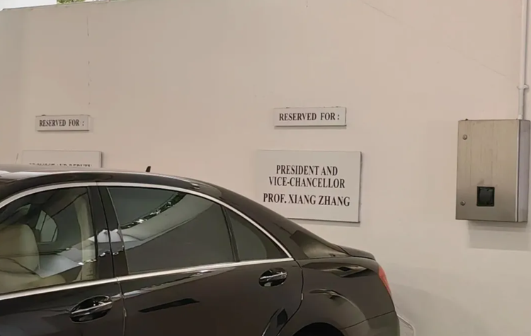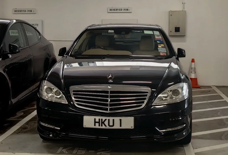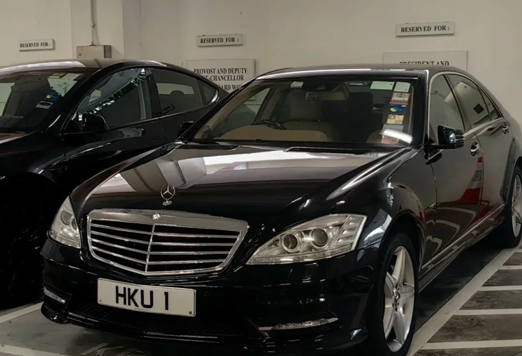 校長的車有專屬的車位,以前奔馳停在大學的地庫,墻上還貼了標識。前面說了,香港大學英文簡寫“HKU”,張翔是校長,也是學校的1號人物,自然而然對應1。或許也能說“Hong kong University No.1”香港大學第一的意思。