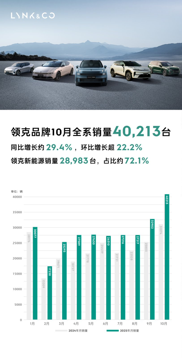 在中國汽車品牌向高端化邁進的大趨勢下,領克品牌歷經九年發(fā)展,逐步在高端汽車市場站穩(wěn)腳跟。2025年10月,領克公布了當月的銷售數(shù)據(jù),單月銷量達到40,213臺,同比增長約29.4%,環(huán)比增長超22.2%,品牌加權平均價突破20萬元。這一成績體現(xiàn)了領克在銷量增長和品牌價值提升上的雙重成效,反映出中國汽車品牌在高端領域的競爭力。