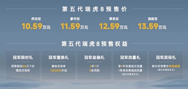 11 月 3 日,奇瑞 “中國新燃油” 戰略下的重點車型 —— 第五代 瑞虎 8(參數|詢價) 在 “世界高城” 正式開啟 “世界高城 馭鑒冠軍” 預售發布活動。這款定位 “豪華大五座家庭 SUV” 的新車,以三大冠軍底座、八大同級唯一配置及五大核心賣點,重新定義家庭燃油車的智能與豪華標準,預售指導價 10.59 萬元起,更推出五重冠軍禮遇,為家庭用戶帶來兼具性能與質感的出行新選擇。