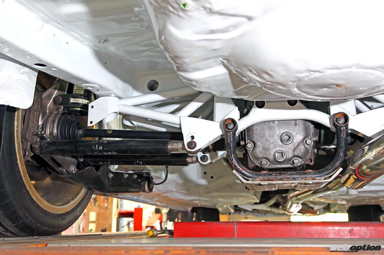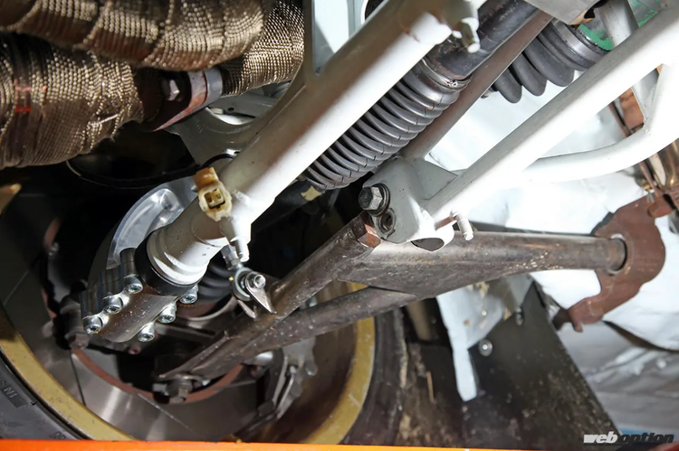 后懸架區(qū)域與前懸架一樣,副車架也是定制部件。后差速器為GDB的R180,無需對副車架進行任何改裝。外傳動軸與WRC賽車的原廠傳動軸相同,而內(nèi)傳動軸則是一次性零件,其花鍵經(jīng)過重新切割以適應R180差速器。