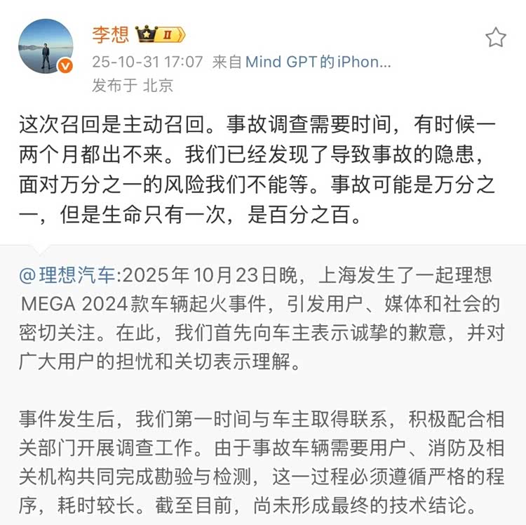 理想汽車創始人李想通過社交媒體表示:“我們已經發現了導致事故的隱患,面對萬分之一的風險我們不能等!”