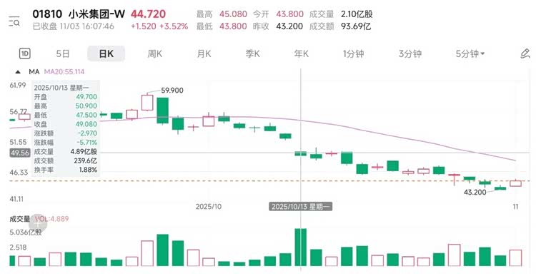 小米集團在“10·13”成都事故后,股價進入下行通道,理想汽車雙股在10月23日之后均遭遇五連跌。