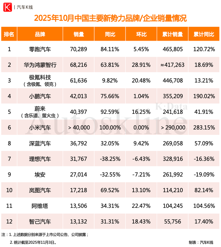 另一方面,零跑汽車與華為鴻蒙智行為月度銷冠展開白熱化角逐,極氪科技、小鵬、蔚來等則在奮力前行。