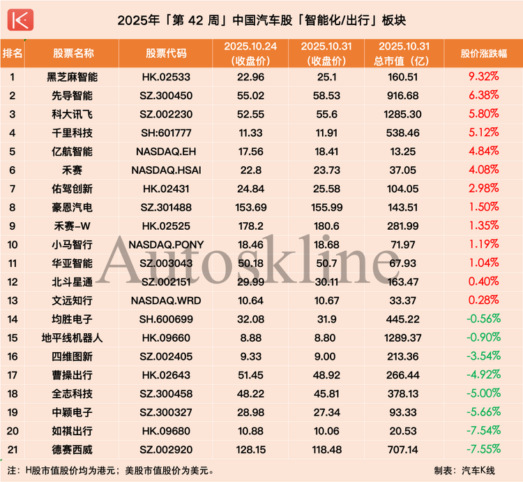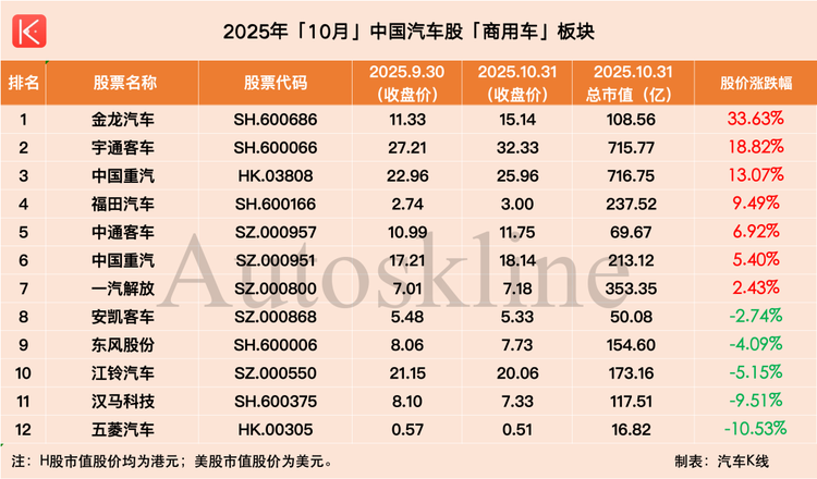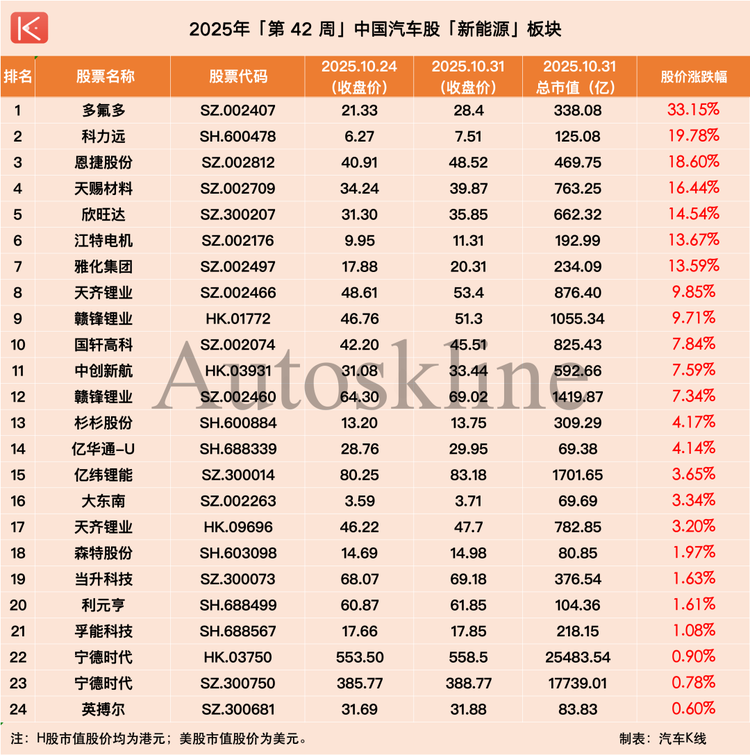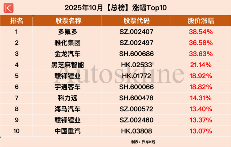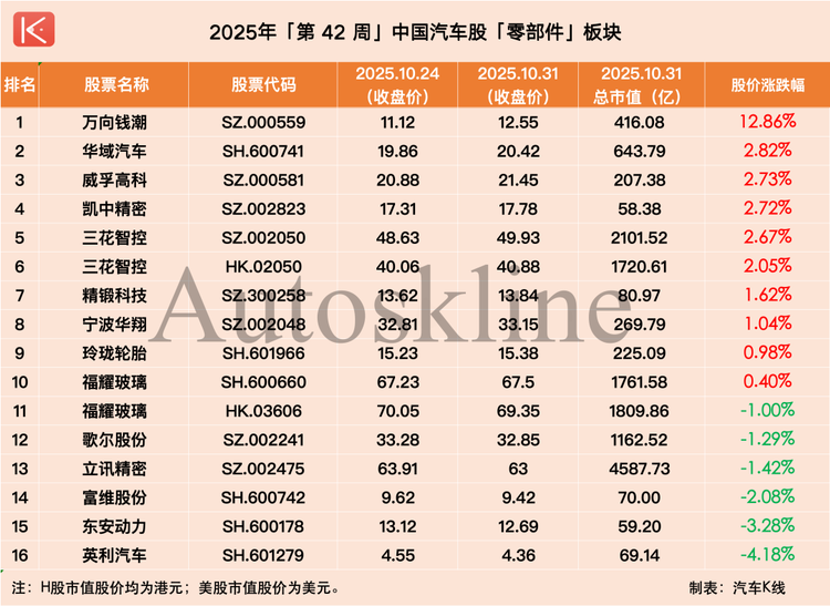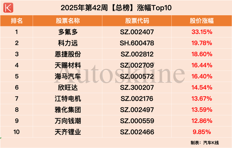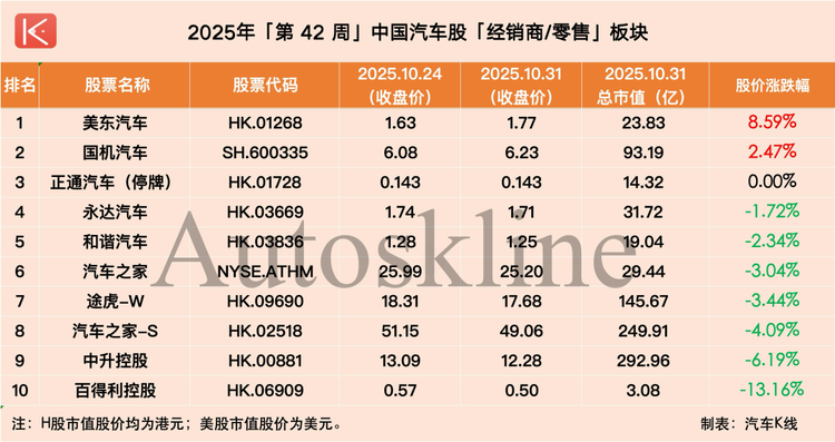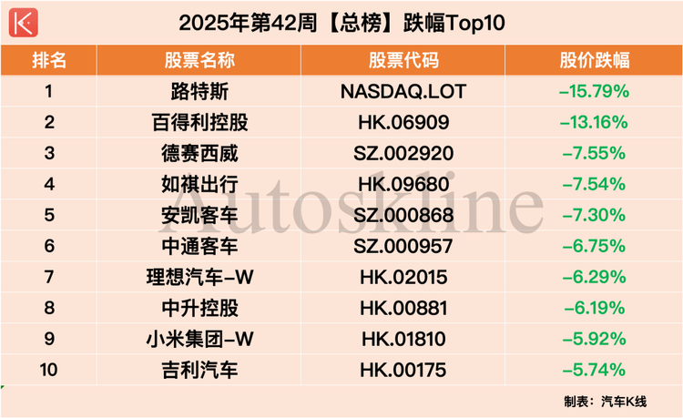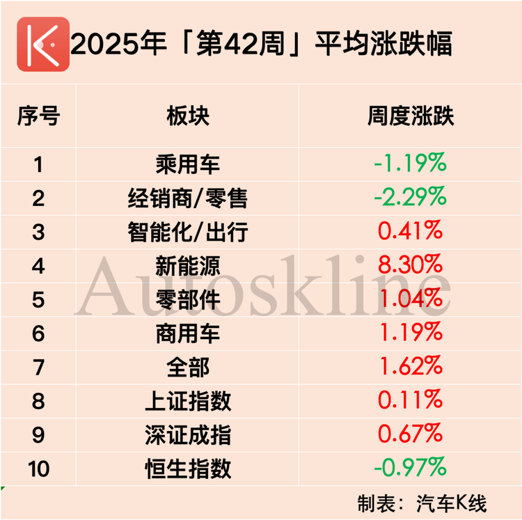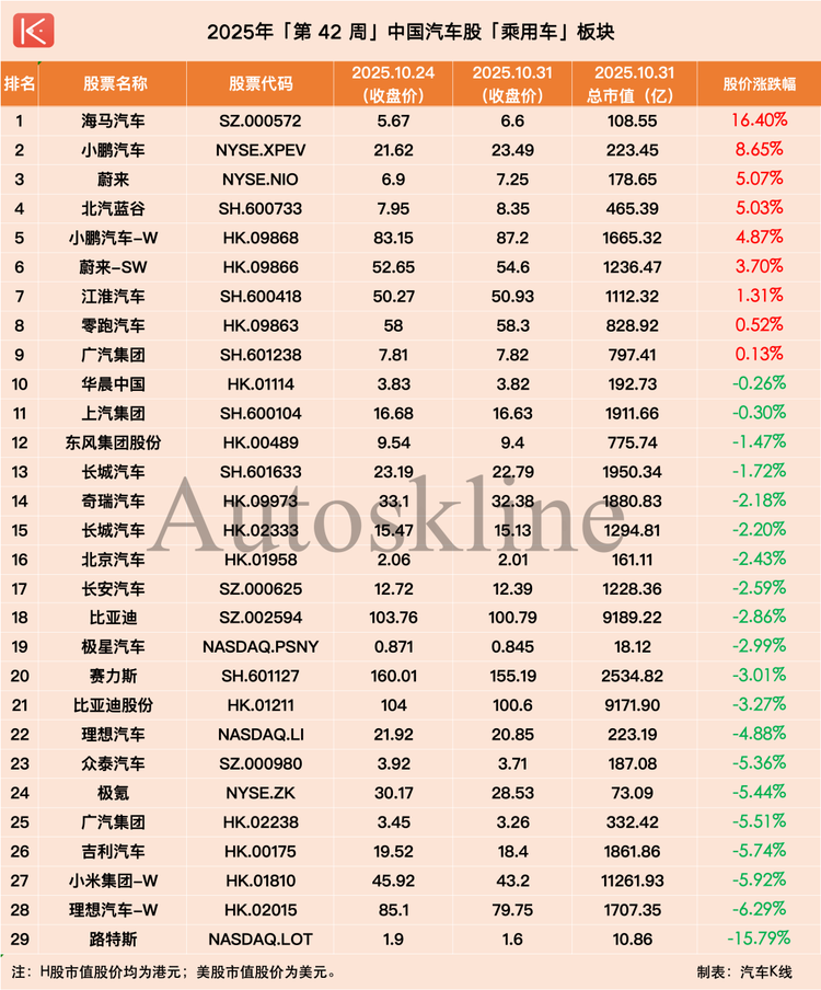 在此背景下,《汽車K線》統(tǒng)計的112只中國汽車股中,近六成在第42周實現(xiàn)上漲,平均股價漲幅1.62%;但時間拉長到整個10月,則僅有約三成半個股實現(xiàn)上漲,平均股價下跌2.66%。