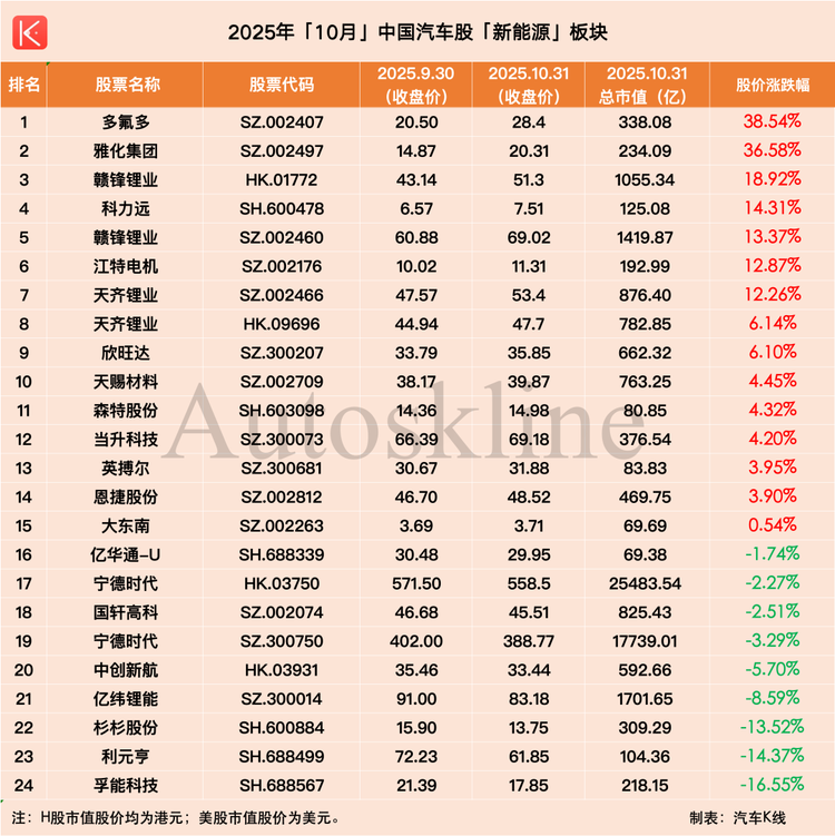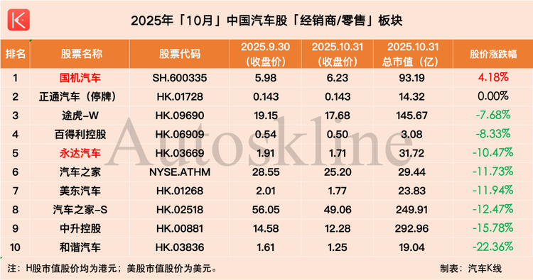 跌幅方面,上周跌幅超過10%的個股僅2只,依次為路特斯(-15.79%)和百得利控股(-13.16%);但10月跌幅超過10%的個股則多達26只。