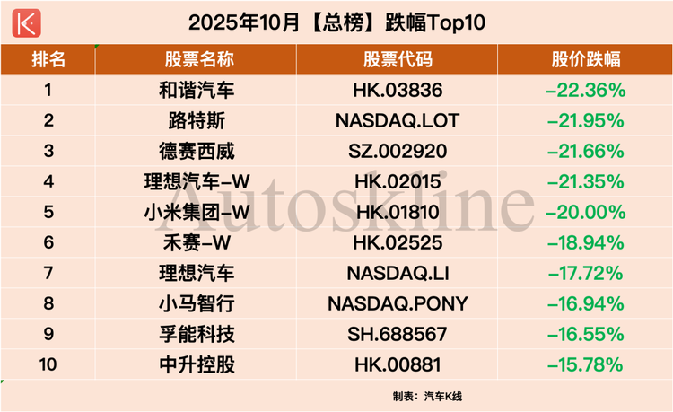 其中,和諧汽車以22.36%的月度跌幅領跌,此外,跌幅超過20%的還有路特斯、德賽西威、理想汽車港股和小米集團,值得一提的是,四者均進入周度、月度總榜跌幅TOP10。