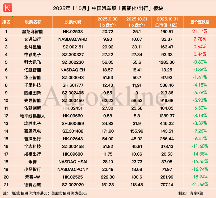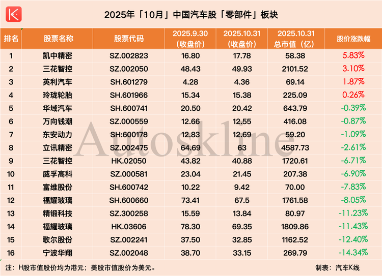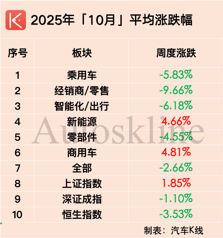 不過,從整個10月來看,則是下跌板塊較多,尤其是經(jīng)銷商/零售板塊跌幅高達9.66%,智能化/出行、乘用車板塊跌幅則均超過5%,即便是跌幅最低的零部件板塊,一周跌幅也達4.55%。