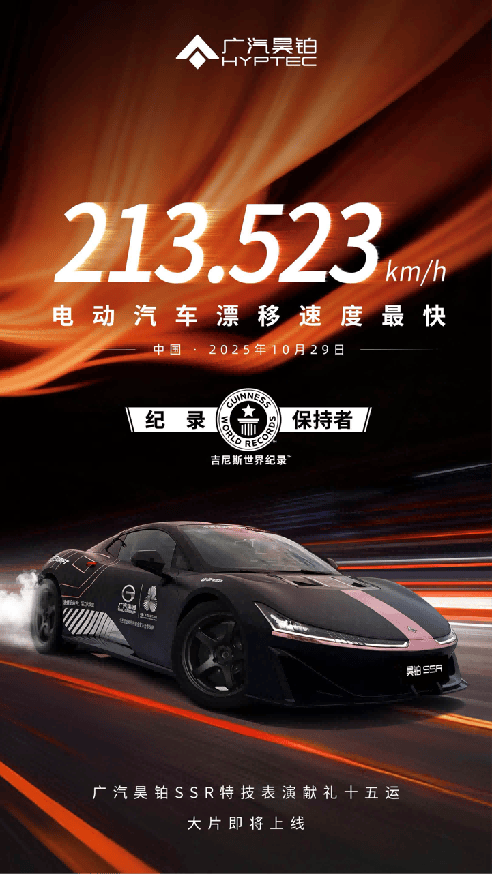 2025年10月29日,廣汽昊鉑旗下純電超跑 昊鉑SSR(參數(shù)|詢價)刷新了純電車漂移最高時速吉尼斯世界紀錄。中國漂移車手葉志成駕駛昊鉑SSR完成極限漂移挑戰(zhàn),在30度漂移角度維持超50米的高難度條件下,以213.523km/h的漂移速度刷新了純電車漂移最高時速世界紀錄。