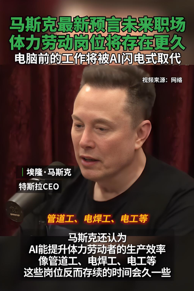 有趣的是在上述最新的馬斯克播客節目中,其不僅講到了諸如郵件處理、電話客服等桌面工作正在快速消失,編程、內容創作等工作的消失預測;更講到了諸如焊接、管道、電工等工作會存在更長的時間。