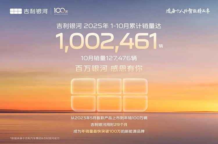 然而,就在2025年10月,中國汽車品牌陣營中一顆耀眼的新星——吉利銀河,以超越預期的速度提前撞線。官方宣布,截至今年10月,吉利銀河年度累計銷量已突破100萬輛大關,達到1002461輛,成為繼特斯拉、比亞迪后全球第三家達成百萬年銷的新能源汽車品牌。