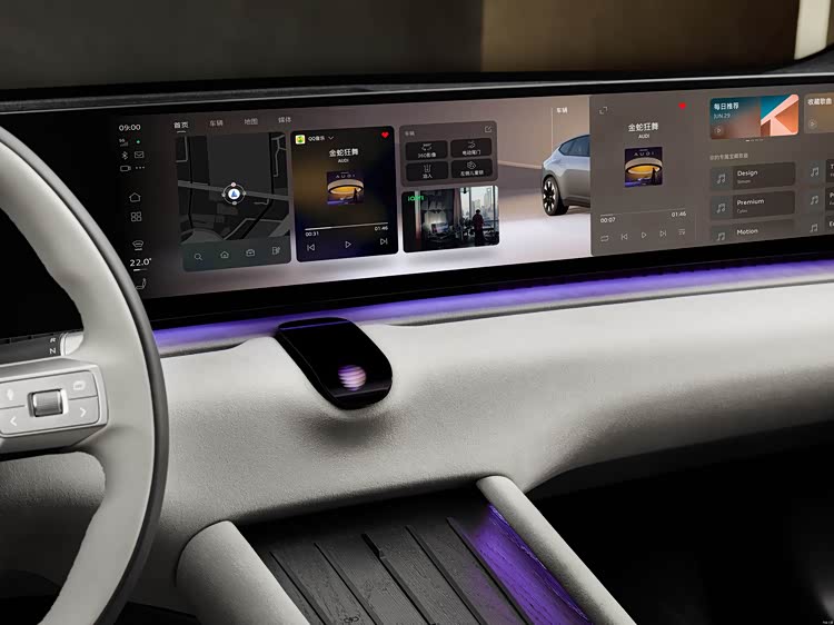 奧迪智慧島位于中央扶手箱前方,通過小屏+滾輪的方式實現香氛、電話和空調等幾十項功能的控制,比語音的“指令輸入+識別+執行”更便捷。在車機上,E5 Sportback的AUDI OS系統把高頻功能和關鍵信息以卡片的形式置于頂層界面,再配合滑動方式,操作同樣便捷。