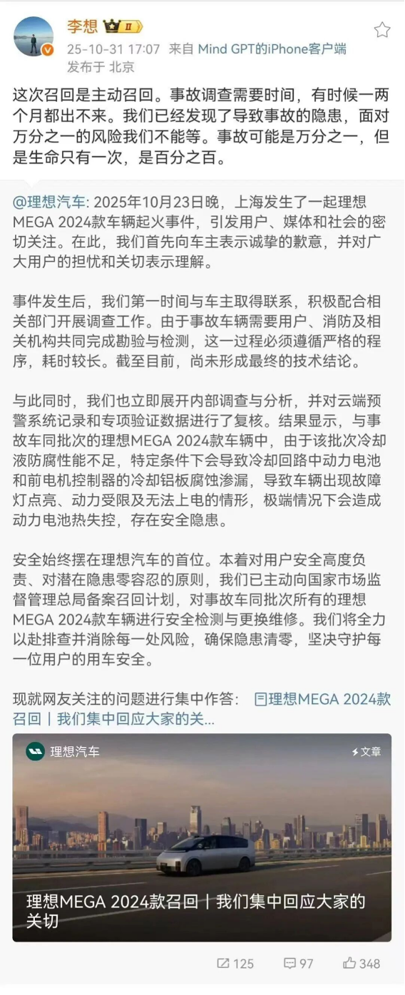 比如,上周理想燒了兩輛車后,主動召回了一個批次的MEGA產(chǎn)品,其原因在于“冷卻液防腐性能不足,可能導(dǎo)致冷卻鋁板腐蝕滲漏,極端情況下觸發(fā)動力電池?zé)崾Э兀嬖诎踩[患”。簡單來說,這顯然不是電池的問題。