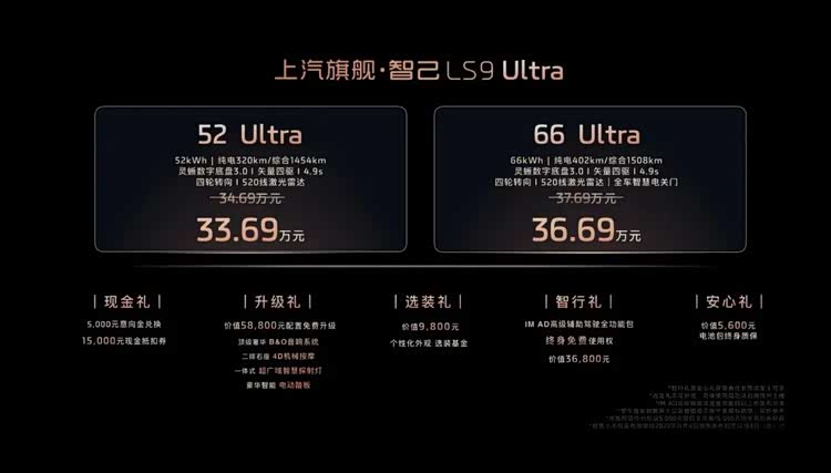 11月4日,上汽旗艦? 智己LS9(參數|詢價)全球首發并開啟預售。新車推出兩款增程版本,52Ultra版預售權益價33.69萬元,66Ultra版預售權益價36.69萬元。