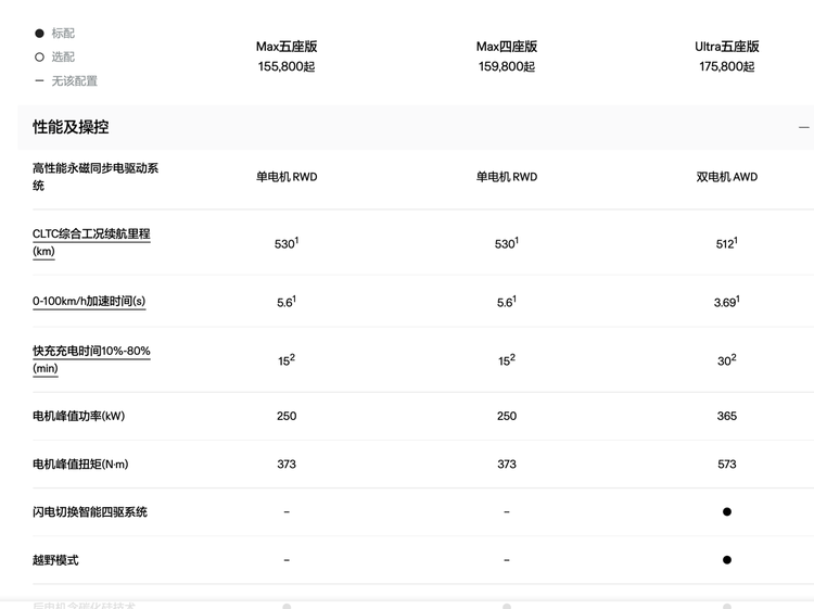 Max為后驅,250kW,61度磷酸鐵鋰,CLTC續航530km,4.5C充電倍率。