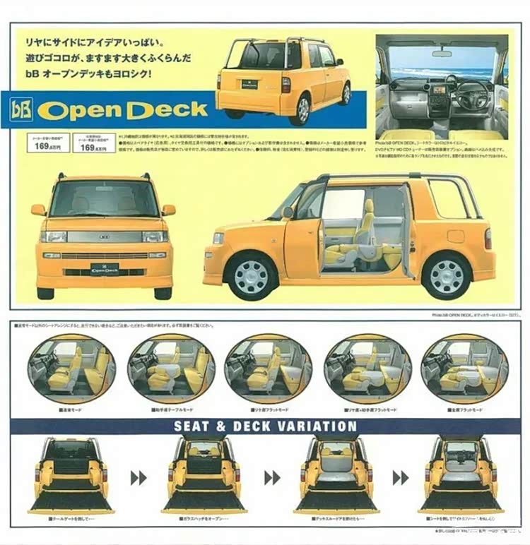 早期的bB采用高大方正的車身設(shè)計,既保證了車內(nèi)空間寬敞,又兼顧了良好的視野和便捷的停車性能。而基于這臺車,豐田的工程師們也進(jìn)行了大膽嘗試,他們鋸掉了bB的車頂,打造了一個小型后貨箱,作為一臺官方打造的改裝產(chǎn)品,豐田將其命名為bB Open Deck,于2001年正式登陸市場銷售。