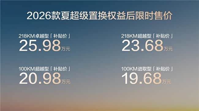 2025年11月4日,2026款夏正式上市,此次共推出4款車型,限時超級置換價19.68—25.98萬元。僅需中級SUV的價格,就可享有超越30萬級的豪華配置。