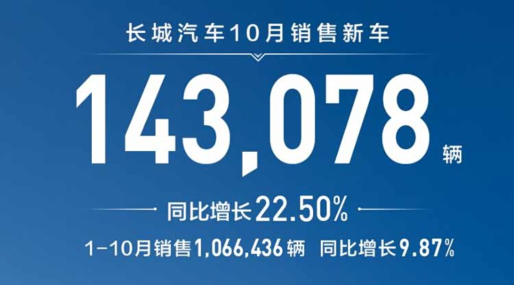 銷量快報顯示,長城汽車10月份總銷量為14.3萬臺,同比勁增22.5%。這樣的成績,堪稱長城歷史最近10月銷量表現(xiàn)。
