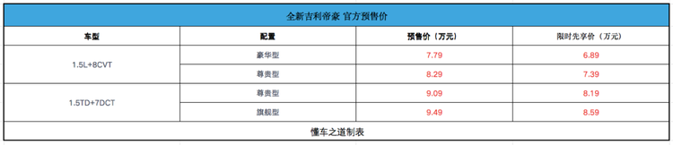 【懂車之道 產品】近日,懂車之道獲悉,全新一代 帝豪(參數|詢價)正式開啟預售,共推出4款配置,預售價區間為7.79-9.49萬元,限時先享價為6.89-8.59萬。下面,和大家一起來看看新車的產品力如何?