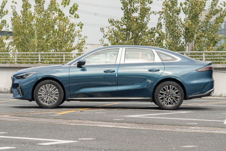 來到車身側面,側面線條流暢,凌厲的型面裝飾,車身姿態前低后高。車身尺寸方面,長寬高分別為4815/1885/1480mm,軸距為2755mm,相比老款車型,全面加大。