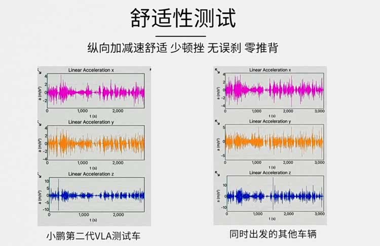 從上面這個關于減速避讓時的加速度對比,就能看出小鵬第二代VLA的平順性提升——整體波動更小。要知道,這些舒適性體驗提升,本就應該是以通勤為核心的智駕輔助需要關注的重點之一,這東西的核心不就是讓人舒緩壓力么?