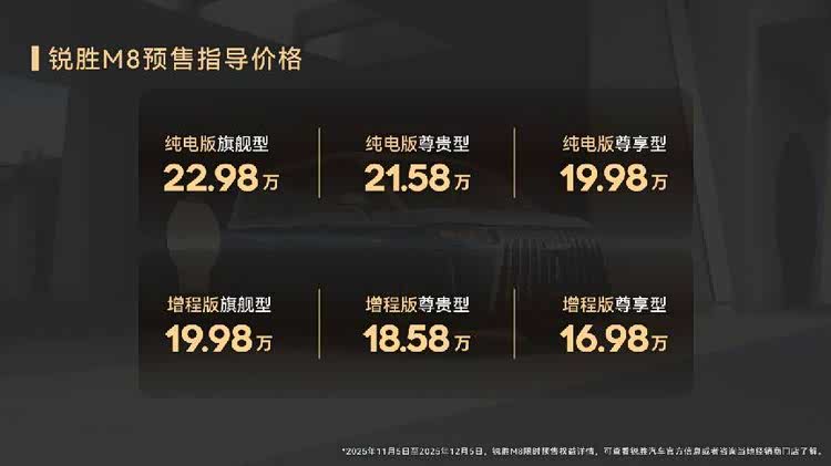 11月5日,北京汽車制造廠旗下銳勝汽車正式宣布全新大型MPV 銳勝M8(參數|詢價)開啟預售,增程版預售價16.98萬元起,純電版19.98萬元起。新車以“越級空間、越級補能、越級續航、越級舒享”四大核心亮點,精準覆蓋商務接待、家庭出行、高端營運、戶外休旅四大核心場景,試圖打破傳統MPV的功能壁壘,為用戶提供“宜商宜家宜旅”的全能解決方案。