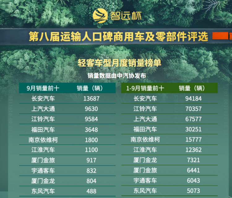 從累計銷量看,1–9月輕客市場總銷量為324475輛,同比增長14.15%,整體表現優于去年同期。前十車企中,六家實現同比增長,宇通客車增幅達64.75%,長安汽車增長30%,增勢顯著。