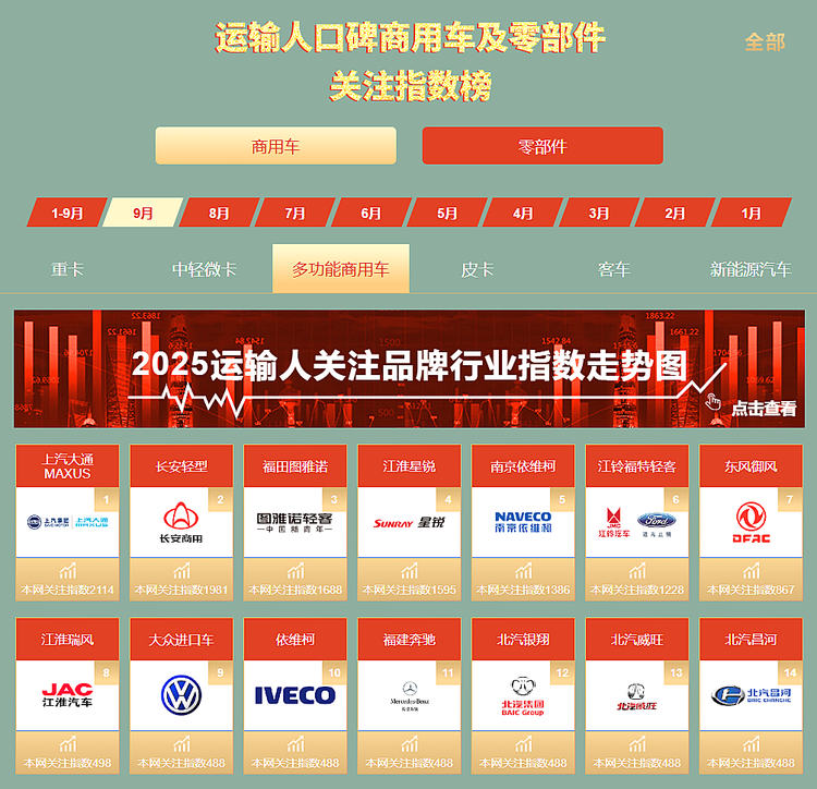 在9月運輸人品牌指數榜中,上汽大通MAXUS、長安輕型商用車、 福田圖雅諾(參數|詢價)、江淮星銳、南京依維柯、江鈴福特輕客、東風御風、江淮瑞風等品牌關注度較高。
