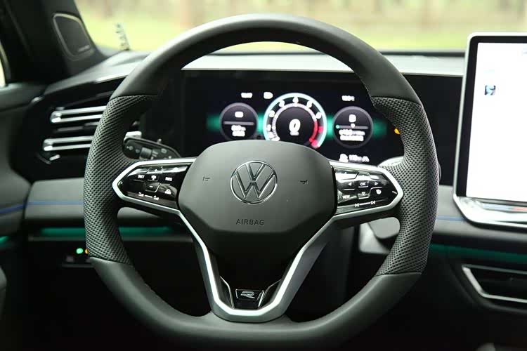 方向盤采用皮質包裹,具備加熱功能,操作鍵是觸控式,左手區域的操控主要是駕駛輔助,右手是界面設定、語音操作等。