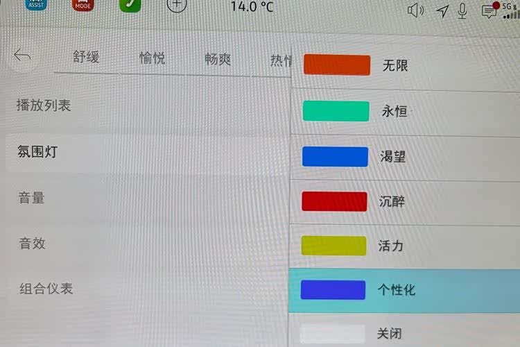 第3個功能是氛圍模式的設定。該車的氛圍模式,分為愉悅、暢爽、熱情、寧靜和個性化,共5種,滿足不同的喜好與需求。