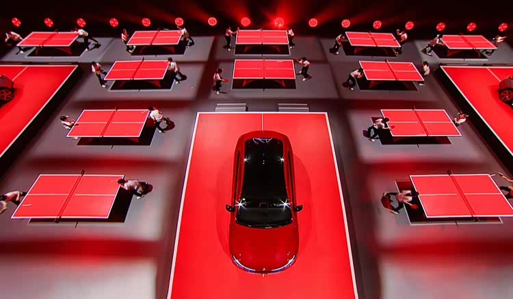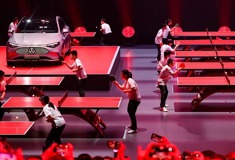 沒錯,整個觀眾席全部電動前移,原先的大幕完全升起,舞臺退后。新的大幕緩緩拉開,整片的舞臺,全是乒乓球桌。孩子們揮拍的身影和擊打乒乓球被放大的音效結合舞臺效果,呈現了奔馳全場最大的一場戲劇張力。