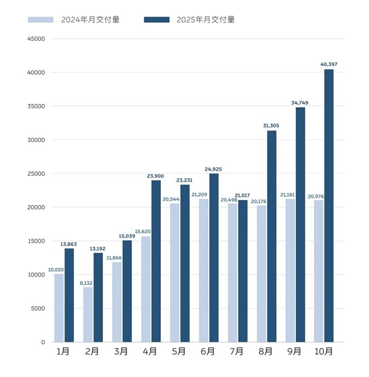 小米汽車10月交付量保持9月勢頭,達到40000輛以上,連續第2個月站穩這一高位,可見其產能交付的穩定性。目前,小米在售車型包括SU7、SU7 Ultra和YU7,為應對快速增長的需求,公司正全力擴大產能:一期工廠設計年產能15萬輛已接近極限,二期工廠具備同等產能并投入生產,三期工廠則在建設中,以確保供應跟得上市場步伐。