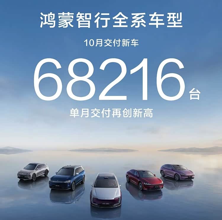 鴻蒙智行在10月創下雙項紀錄,單月交付新車68216輛,刷新歷史新高,同時全系累計交付突破100萬輛,從零到百萬僅用時43個月,創下新勢力品牌最快達成百萬交付紀錄,此外,鴻蒙智行當月成交均價達39萬元。