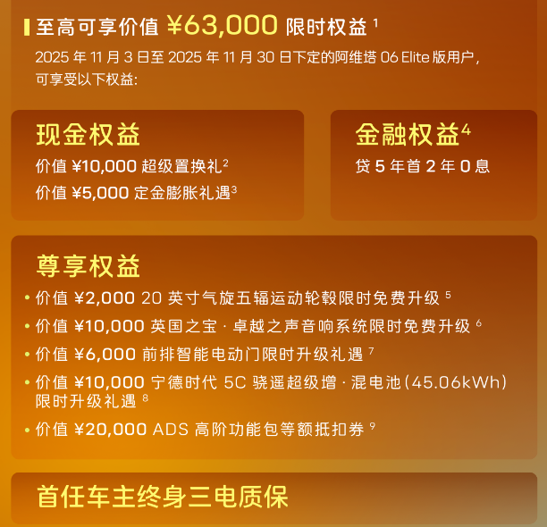 阿維塔還推出多項限時(即日起至11月30日)權益,包括“貸5年首2年0息”金融方案、20英寸氣旋五輻運動輪轂、英國之寶?卓越之聲音響系統、前排智能電動門、寧德時代5C驍遙超級增?混電池(45.06kWh)限時升級,另贈價值20000元ADS高階功能包等額抵扣券、首任車主終身三電質保等。