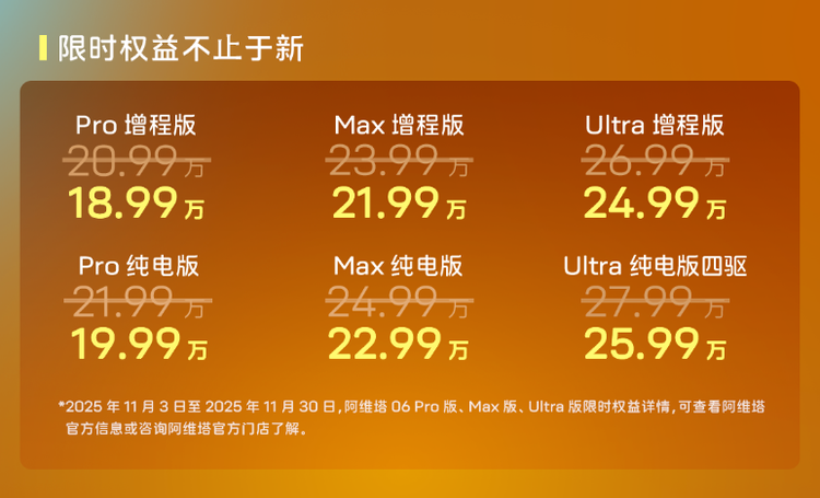 此外,阿維塔06Pro版、Max版、Ultra版也同步推出限時權益,增程版和純電版車型到手價最低分別為18.99萬元和19.99萬元。