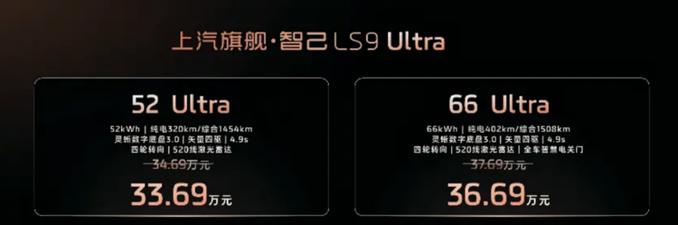 車型選擇方面,智己LS9目前預(yù)售的兩款車型限時(shí)權(quán)益價(jià)33.69-36.69萬元,兩個(gè)配備版本分別為55 Ultra和63 Ultra,對(duì)應(yīng)的純電續(xù)航里程分別為320km和402km。2026年一季度,智己LS9還將推出配置更高的Hyper版本,敬請(qǐng)期待。