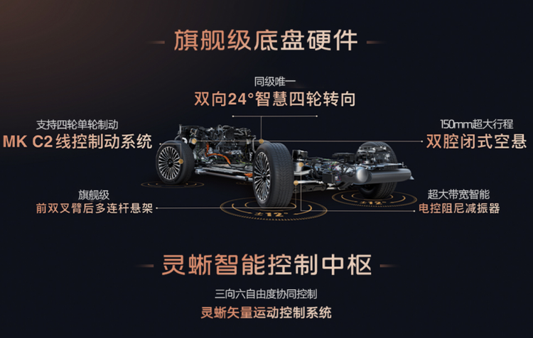 同時(shí)新車還配備全向24度的后輪轉(zhuǎn)向系統(tǒng),能降低轉(zhuǎn)彎半徑,提升駕駛靈活性。另外,智己LS9還配備150mm行程閉式雙腔空氣懸架、可變阻尼減振器、線控轉(zhuǎn)向等技術(shù)。
