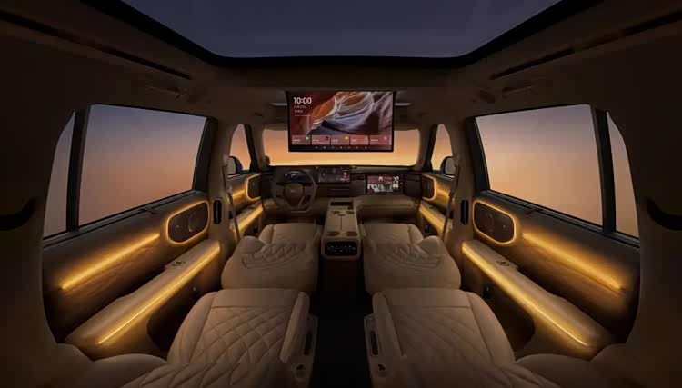 車內(nèi)配備手機(jī)雙無線充電面板、15.6英寸副駕娛樂屏、21.5英寸后排娛樂屏、后排小桌板、車載小冰箱、二排右側(cè)零重力座椅、座椅通風(fēng)加熱按摩等功能、電動(dòng)車門,甚至是520線激光雷達(dá)都應(yīng)有盡有。