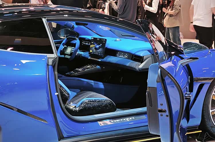 騰勢Z敞篷版內飾采用了冷色調為主的配色方案,大面積藍色Alcantara麂皮材質和碳纖維材質的交替鋪陳,再加上藍色高級復合面料和黃色的菱形縫線,多色的拼接工藝,還有亮黑色鋼琴烤漆飾板、啞光色碳纖維裝飾面板的交替運用,再配上前排兩個桶裝賽車座椅和四點式安全帶,營造出了更加濃郁的賽車氛圍。中控臺的布局與此前曝光的騰勢Z量產版車型保持一致,中控臺采用了類似游戲手柄樣式的方向盤,兩側加入了大尺寸換擋撥片,配合著更多高階智駕輔助,帶來了更加優秀的操控體驗。科技感方面,該車配備了彩色全液晶儀表、AR-HUD抬頭顯示系統、巨大的懸浮式中控大屏和矩形嵌入式副駕顯示屏,同時還有帝瓦雷品牌高端音響。